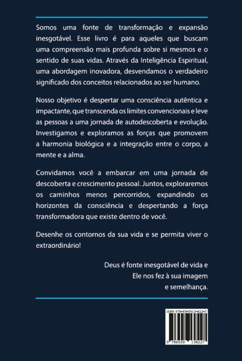 Somos uma fonte de transformação e expansão inesgotável. Esse livro é para aqueles que buscam uma compreensão mais profunda sobre si mesmos e o sentido de suas vidas. Através da Inteligência Espiritual, uma abordagem inovadora, desvendamos o verdadeiro significado dos conceitos relacionados ao ser humano. Nosso objetivo é despertar uma consciência autêntica e impactante, que transcenda os limites convencionais e leve as pessoas a uma jornada de autodescoberta e evolução. Investigamos e exploramos as forças que promovem a harmonia biológica e a integração entre o corpo, a mente e a alma. Convidamos você a embarcar em uma jornada de descoberta e crescimento pessoal. Juntos, exploraremos os caminhos menos percorridos, expandindo os horizontes da consciência e despertando a força transformadora que existe dentro de você. Desenhe os contornos da sua vida e se permita viver o extraordinário! Deus é fonte inesgotável de vida e Ele nos fez à sua imagem e semelhança.