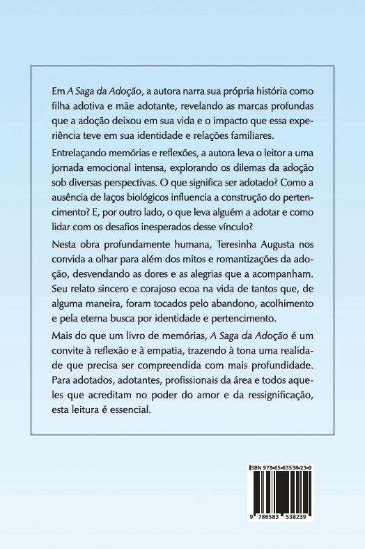 Nesta obra profundamente humana, Teresinha Augusta convida a olhar para além dos mitos e romantizações da adoção, desvendando as dores e as alegrias que a acompanham.
