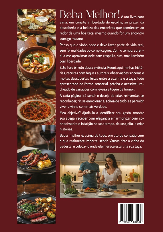 Este livro é o resultado dessa experiência. Nele, reuni minhas histórias, receitas com toques autorais, observações sinceras e muitas descobertas feitas entre a cozinha e a taça. Tudo é apresentado de forma sensorial, prática e acessível, recheado de variações com leveza e um toque de humor. A cada página, o leitor sentirá o desejo de criar, reinventar, se reconhecer, rir, se emocionar e, acima de tudo, se permitir viver o vinho com mais verdade.