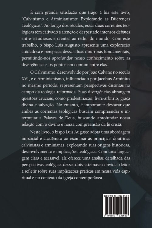 Neste livro, o bispo Luis Augusto adota uma abordagem imparcial e acadêmica ao examinar as principais doutrinas calvinistas e arminianas, explorando suas origens históricas, desenvolvimento e implicações teológicas. Com uma linguagem clara e acessível, ele oferece uma análise detalhada das perspectivas teológicas desses dois sistemas e convida o leitor a refletir sobre suas implicações práticas em nossa vida espiritual e no contexto da igreja contemporânea.