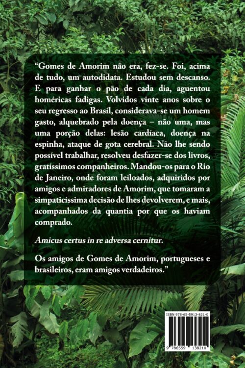 E para ganhar o pão de cada dia, aguentou homéricas fadigas. Volvidos vinte anos sobre o seu regresso ao Brasil, considerava-se um homem gasto, alquebrado pela doença – não uma, mas uma porção delas: lesão cardíaca, doença na espinha, ataque de gota cerebral. Não lhe sendo possível trabalhar, resolveu desfazer-se dos livros, gratíssimos companheiros. Mandou-os para o Rio de Janeiro, onde foram leiloados, adquiridos por amigos e admiradores de Amorim, que tomaram a simpaticíssima decisão de lhes devolverem, e mais, acompanhados da quantia por que os haviam comprado.