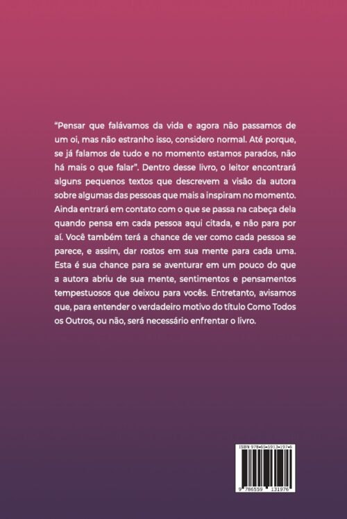 Esta é sua chance para se aventurar em um pouco do que a autora abriu de sua mente, sentimentos e pensamentos tempestuosos que deixou para vocês. Entretanto, avisamos que, para entender o verdadeiro motivo do título Como Todos os Outros, ou não, será necessário enfrentar o livro.