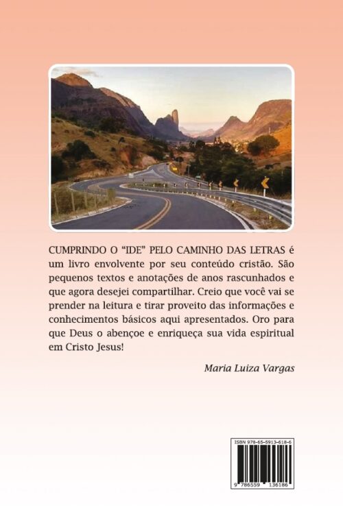 CUMPRINDO O “IDE” PELO CAMINHO DAS LETRAS é um livro envolvente por seu conteúdo cristão. São pequenos textos e anotações de anos rascunhados e que agora desejei compartilhar. Creio que você vai se prender na leitura e tirar proveito das informações e conhecimentos básicos aqui apresentados. Oro para que Deus o abençoe e enriqueça sua vida espiritual em Cristo Jesus!”