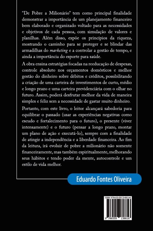 “De Pobre a Milionário” tem como principal finalidade demonstrar a importância de um planejamento financeiro bem elaborado e organizado voltado para as necessidades e objetivos de cada pessoa, com simulação de valores e planilhas. Além disso, expõe os princípios da riqueza, mostrando o caminho para se proteger e se blindar das armadilhas do marketing e a controlar a gestão de tempo, e ainda a importância do esporte para a saúde.