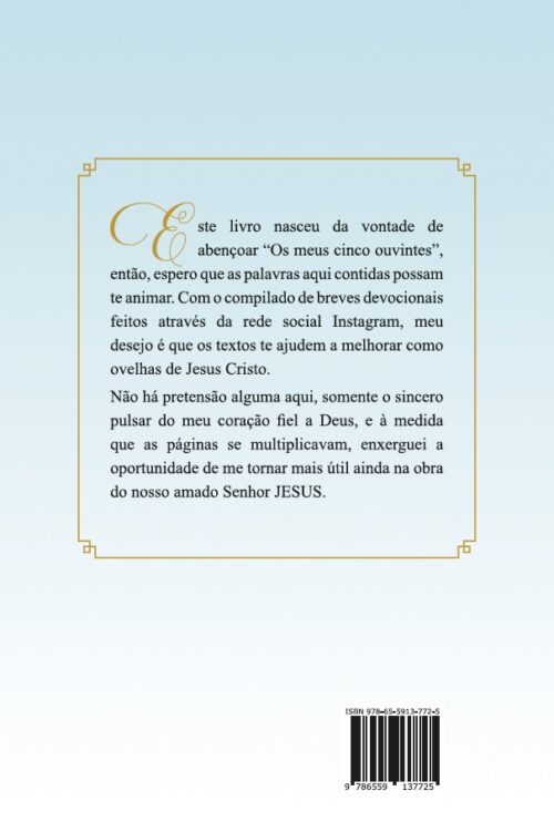 Este livro nasceu da vontade de abençoar “Os meus cinco ouvintes”, então, espero que as palavras aqui contidas possam te animar. Com o compilado de breves devocionais feitos através da rede social Instagram, meu desejo é que os textos te ajudem a melhorar como ovelhas de Jesus Cristo.