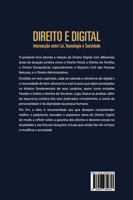 O presente livro aborda a relação do Direito Digital com diferentes áreas de atuação jurídica como o Direito Penal, o Direito de Família, o Direito Extrajudicial – especialmente o Registro Civil das Pessoas Naturais – e o Direito Administrativo.