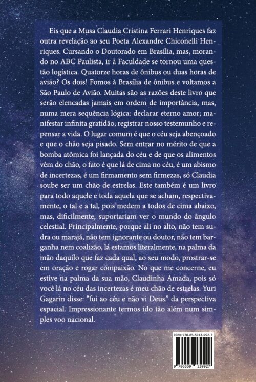 Muitas são as razões deste livro que serão elencadas jamais em ordem de importância, mas numa mera sequência lógica: declarar eterno amor; manifestar infinita gratidão; registrar nosso testemunho e repensar a vida. O lugar comum é que o céu seja abençoado e que o chão seja pisado. Sem entrar no mérito de que a bomba atômica foi lançada do céu e de que os alimentos vêm do chão, o fato é que lá de cima no céu, é um abismo de incertezas, é um firmamento sem firmezas; só Claudia soube ser um chão de estrelas.