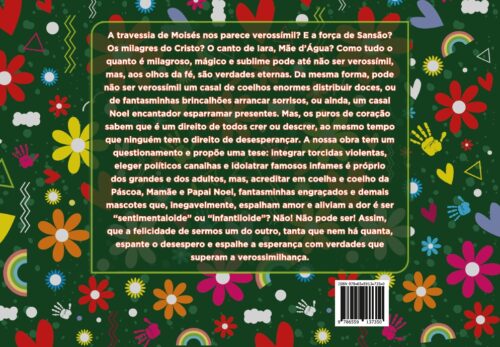 A travessia de Moisés nos parece verossímil? E a força de Sansão? Os milagres do Cristo? O canto de Iara, Mãe d’Água? Como tudo o quanto é milagroso, mágico e sublime pode até não ser verossímil, mas, aos olhos da fé, são verdades eternas. Da mesma forma, pode não ser verossímil um casal de coelhos enormes distribuir doces, ou de fantasminhas brincalhões arrancar sorrisos, ou ainda, um casal Noel encantador esparramar presentes. Mas, os puros de coração sabem que é um direito de todos crer ou descrer, ao mesmo tempo que ninguém tem o direito de desesperançar. A nossa obra tem um questionamento e propõe uma tese: integrar torcidas violentas, eleger políticos canalhas e idolatrar famosos infames é próprio dos grandes e dos adultos, mas, acreditar em coelha e coelho da Páscoa, Mamãe e Papai Noel, fantasminhas engraçados e demais mascotes que, inegavelmente, espalham amor e aliviam a dor é ser “sentimentaloide” ou “infantiloide”? Não! Não pode ser! Assim, que a felicidade de sermos um do outro, tanta que nem há quanta, espante o desespero e espalhe a esperança com verdades que superam a verossimilhança