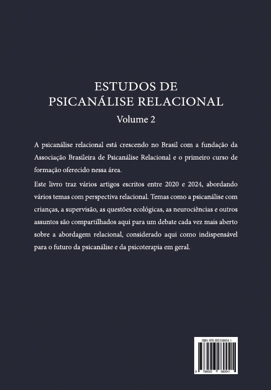 Este livro traz vários artigos escritos entre 2020 e 2024, abordando diversos temas sob uma perspectiva relacional. Temas como a psicanálise com crianças, a supervisão, as questões ecológicas, as neurociências e outros assuntos são compartilhados aqui, promovendo um debate cada vez mais aberto sobre a abordagem relacional — considerada indispensável para o futuro da psicanálise e da psicoterapia em geral.