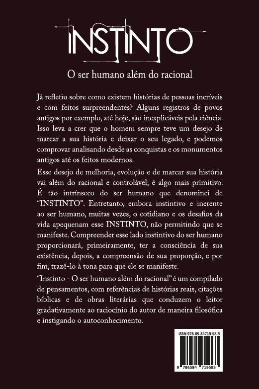 Instinto – O Ser Humano Além do Racional é um compilado de pensamentos, com referências de histórias reais, citações bíblicas e de obras literárias que conduzem o leitor gradativamente ao raciocínio do autor, de maneira filosófica e instigando o autoconhecimento.