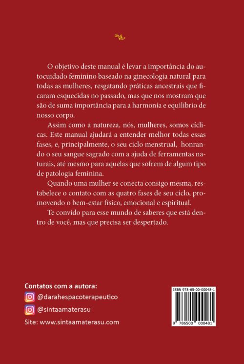 O objetivo deste manual é levar a importância do autocuidado feminino baseado na ginecologia natural para todas as mulheres, resgatando práticas ancestrais que ficaram esquecidas no passado, mas que nos mostram que são de suma importância para a harmonia e equilíbrio de nosso corpo.