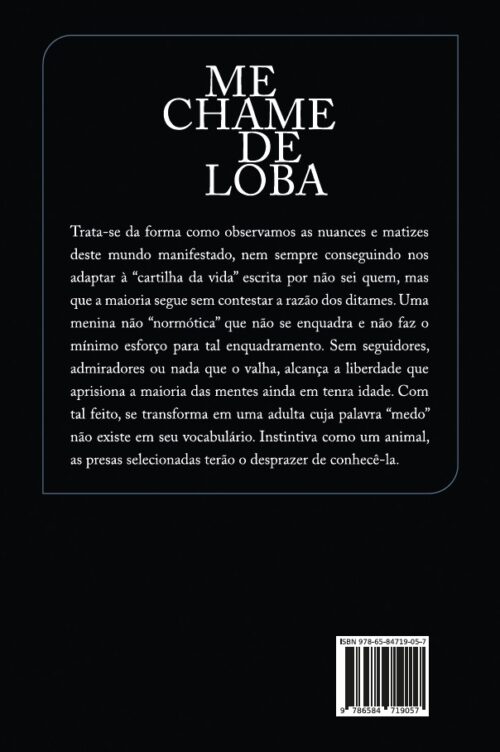 Trata-se da forma como observamos as nuances e matizes deste mundo manifestado, nem sempre conseguindo nos adaptar à “cartilha da vida” escrita por não sei quem, mas que a maioria segue sem contestar a razão dos ditames. Uma menina não “normótica” que não se enquadrada e não faz o mínimo esforço para tal enquadramento. Sem seguidores, admiradores ou nada que o valha, alcança a liberdade que aprisiona a maioria das mentes ainda em tenra idade. Com tal feito, se transforma em uma adulta cuja palavra “medo” não existe em seu vocabulário. Instintiva como um animal, as presas selecionadas terão o desprazer de conhecê-la.