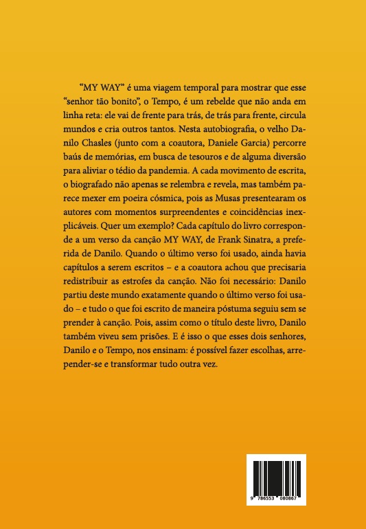 “My Way” é uma obra que nos leva em uma viagem temporal, demonstrando que o Tempo, descrito como um senhor tão bonito, é um rebelde que não segue uma linha reta. Ele se move de frente para trás, de trás para frente, circula mundos e cria outros tantos. Esta é a premissa da autobiografia do velho Danilo Chasles, que, em parceria com a coautora Daniele Garcia, percorre baús de memórias em busca de tesouros e de alguma diversão para aliviar o tédio da pandemia.