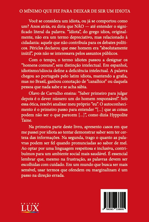 Na primeira parte deste livro, apresento casos em que me comportei como um idiota ao tentar demonstrar saber sem ter certeza das informações. Na segunda parte, discuto o quanto as palavras podem ser venenosas quando pronunciadas com doçura. Ao optar por uma linguagem respeitosa e inclusiva, contribuímos para um ambiente social mais saudável.