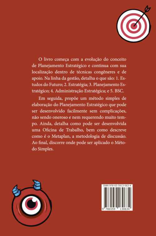 Em seguida, propõe um método simples de elaboração do Planejamento Estratégico que pode ser desenvolvido facilmente sem complicações, não sendo oneroso e nem requerendo muito tempo. Ainda, detalha como pode ser desenvolvida uma Oficina de Trabalho, bem como descreve como é o Metaplan, a metodologia de discussão. Ao final, discorre onde pode ser aplicado o Método Simples.