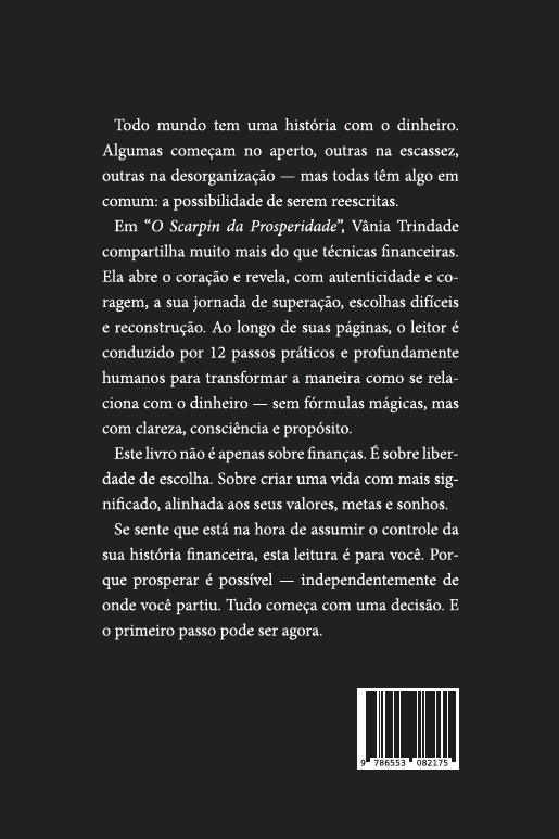 No livro O Scarpin da Prosperidade, a autora Vânia Trindade vai além de simplesmente compartilhar técnicas financeiras. Ela abre seu coração e revela, com autenticidade e coragem, sua própria jornada de superação, escolhas difíceis e reconstrução. O leitor é conduzido por 12 passos práticos e profundamente humanos para transformar a maneira como se relaciona com o dinheiro. Não se trata de fórmulas mágicas, mas de clareza, consciência e propósito.