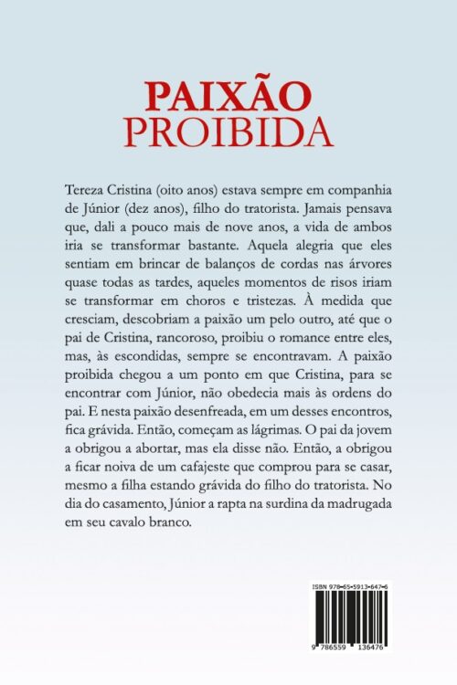 Tereza Cristina (oito anos) estava sempre em companhia de Júnior (dez anos), filho do tratorista. Jamais pensava que, dali a pouco mais de nove anos, a vida de ambos iria se transformar bastante. Aquela alegria que eles sentiam em brincar de balanços de cordas nas árvores quase todas as tardes, aqueles momentos de risos iriam se transformar em choros e tristezas. À medida que cresciam, descobriam a paixão um pelo outro, até que o pai de Cristina, rancoroso, proibiu o romance entre eles, mas, às escondidas, sempre se encontravam. A paixão proibida chegou a um ponto em que Cristina, para se encontrar com Júnior, não obedecia mais às ordens do pai. E nesta paixão desenfreada, em um desses encontros, fica grávida. Então, começam as lágrimas. O pai da jovem a obrigou a abortar, mas ela disse não. Então, a obrigou a ficar noiva de um cafajeste que comprou para se casar, mesmo a filha estando grávida do filho do tratorista. No dia do casamento, Júnior a rapta na surdina da madrugada em seu cavalo branco.