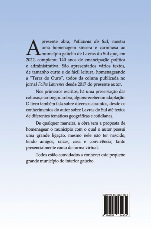 A presente obra, PaLavras do Sul, mostra uma homenagem sincera e carinhosa ao município gaúcho de Lavras do Sul que, em 2022, completou 140 anos de emancipação política e administrativa. São apresentados vários textos, de tamanho curto e de fácil leitura, homenageando a “Terra do Ouro”, todos da coluna publicada no jornal Folha Lavrense desde 2017 do presente autor. Nos primeiros escritos, há uma preservação das colunas, e ao longo da obra, alguns receberam adaptação. O livro também fala sobre diversos assuntos, desde os conhecimentos do autor sobre Lavras do Sul até textos de diferentes temáticas geográficas e cotidianas. De qualquer maneira, a obra tem a proposta de homenagear o município com o qual o autor possui uma grande ligação, mesmo nele não ter nascido, tendo amigos, raízes, casa e convivência, tanto presencialmente como de forma virtual.