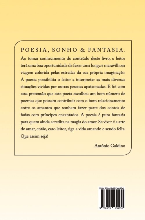 Ao tomar conhecimento do conteúdo deste livro, o leitor terá uma boa oportunidade de fazer uma longa e maravilhosa viagem colorida pelas estradas da sua própria imaginação. A poesia possibilita o leitor a interpretar as mais diversas situações vividas por outras pessoas apaixonadas. E foi com essa pretensão que este poeta escolheu um bom número de poemas que possam contribuir com o bom relacionamento entre os amantes que sonham fazer parte dos contos de fadas com príncipes encantados. A poesia é pura fantasia para quem ainda acredita na magia do amor. Se viver é a arte de amar, então, caro leitor, siga a vida amando e sendo feliz.