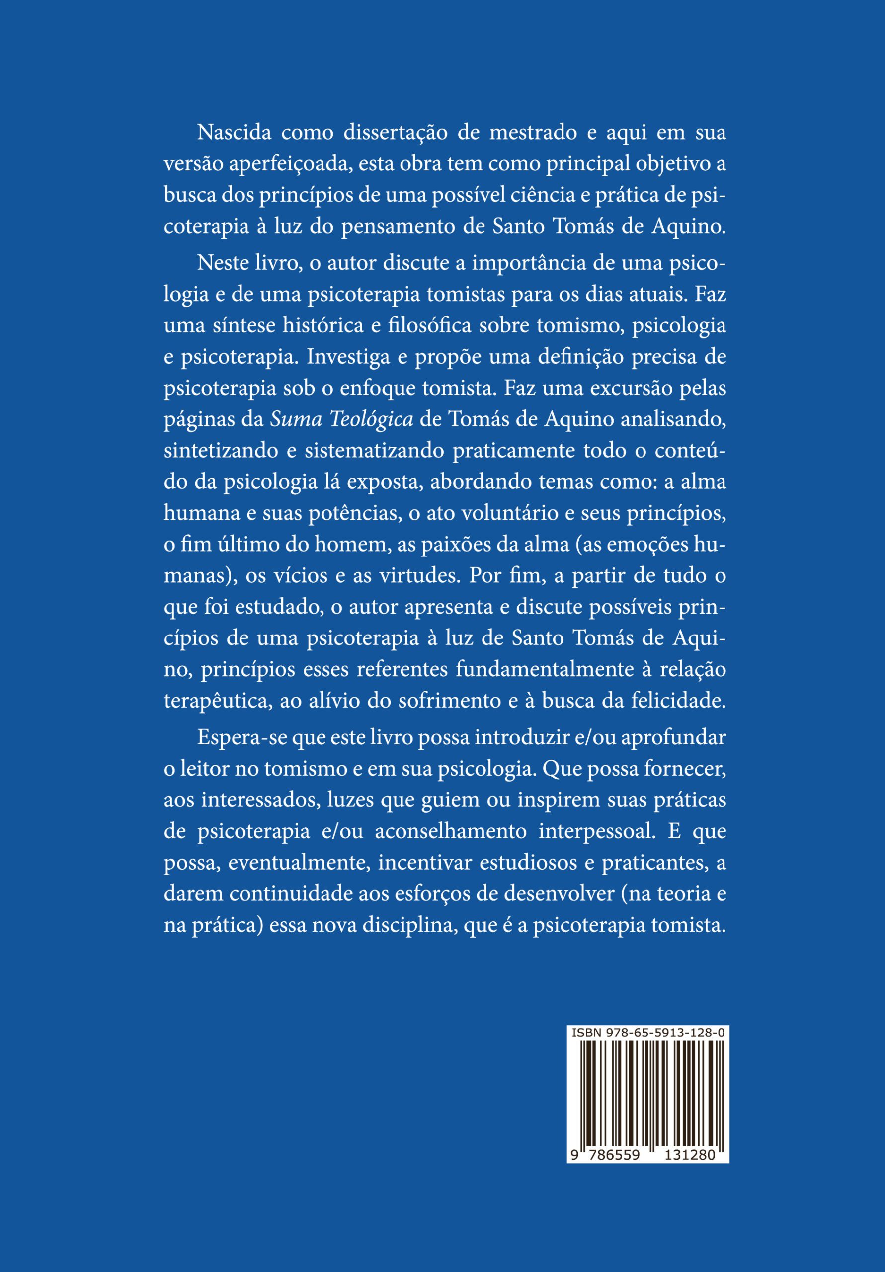 Neste livro, o autor discute a importância de uma psicologia e de uma psicoterapia tomistas para os dias atuais. Faz uma síntese histórica e filosófica sobre tomismo, psicologia e psicoterapia. Investiga e propõe uma definição precisa de psicoterapia sob o enfoque tomista. Faz uma excursão pelas páginas da Suma Teológica de Tomás de Aquino analisando, sintetizando e sistematizando praticamente todo o conteúdo da psicologia lá exposta, abordando temas como: a alma humana e suas potências, o ato voluntário e seus princípios, o fim último do homem, as paixões da alma (as emoções humanas), os vícios e as virtudes. Por fim, a partir de tudo o que foi estudado, o autor apresenta e discute possíveis princípios de uma psicoterapia à luz de Santo Tomás de Aquino, princípios esses referentes fundamentalmente à relação terapêutica, ao alívio do sofrimento e à busca da felicidade.
