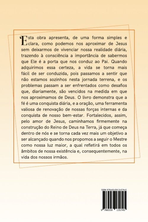 Esta obra apresenta, de uma forma simples e clara, como podemos nos aproximar de Jesus sem deixarmos de vivenciar nossa realidade diária,trazendo à consciência a importância de sabermos que Ele é a porta que nos conduz ao Pai. Quando adquirimos essa certeza, a vida se torna mais fácil de ser conduzida, pois passamos a sentir que não estamos sozinhos nesta jornada terrena, e os problemas passam a ser enfrentados como desafios que, diariamente, são vencidos na medida em que nos aproximamos de Deus. O livro demonstra que a fé é uma conquista diária, e a oração, uma ferramenta valiosa de renovação de nossas forças internas e da conquista de nosso bem-estar. Fortalecidos, assim, pelo amor de Jesus, caminhamos firmemente na construção do Reino de Deus na Terra, já que começa dentro de nós e se torna cada vez mais um objetivo a ser alcançado quando nos propomos a seguir o Mestre como nossa luz maior, a qual refletirá em todos os âmbitos de nossa existência e, consequentemente, na vida dos nossos irmãos
