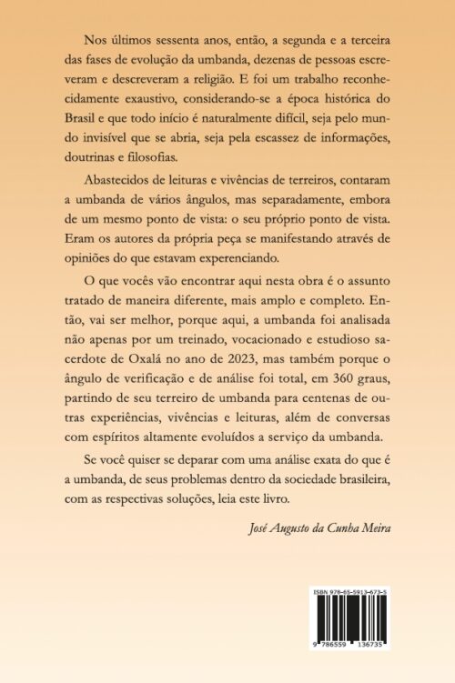 O que vocês vão encontrar aqui nesta obra é o assunto tratado de maneira diferente, mais amplo e completo. Então, vai ser melhor, porque aqui, a umbanda foi analisada não apenas por um treinado, vocacionado e estudioso sacerdote de Oxalá no ano de 2023, mas também porque o ângulo de verificação e de análise foi total, em 360 graus, partindo de seu terreiro de umbanda para centenas de outras experiências, vivências e leituras, além de conversas com espíritos altamente evoluídos a serviço da umbanda.