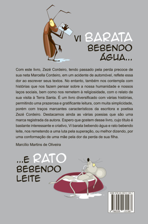 Com este livro, Zezé Cordeiro, tendo passado pela perda precoce de sua neta Marcella Cordeiro, em um acidente de automóvel, reflete essa dor ao escrever seus textos. No entanto, também nos contempla com histórias que nos fazem refletir sobre a nossa humanidade e nossos laços sociais, bem como nos remetem à religiosidade, com o relato de sua visita à Terra Santa. É um livro diversificado com várias histórias, permitindo uma prazerosa e gratificante leitura, com muita simplicidade, porém com traços marcantes característicos da escritora e poetisa Zezé Cordeiro. Destacamos ainda as várias poesias que são uma marca registrada da autora. Espero que gostem desse livro, cujo título é bastante interessante e criativo, Vi barata bebendo água e rato bebendo leite, nos remetendo a uma luta pela superação, ou melhor dizendo, por uma conformação de uma mãe pela dor da perda de sua filha.